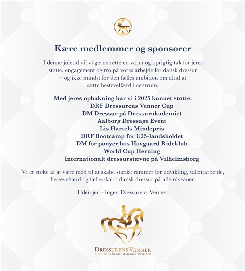 Tak for opbakningen, engagementet og fællesskabet i året, der er gået. Sammen har vi arbejdet for at styrke og udvikle dansk dressursport med fokus på faglighed, horsemanship og hestevelfærd og det ser vi frem til at fortsætte i det kommende år.